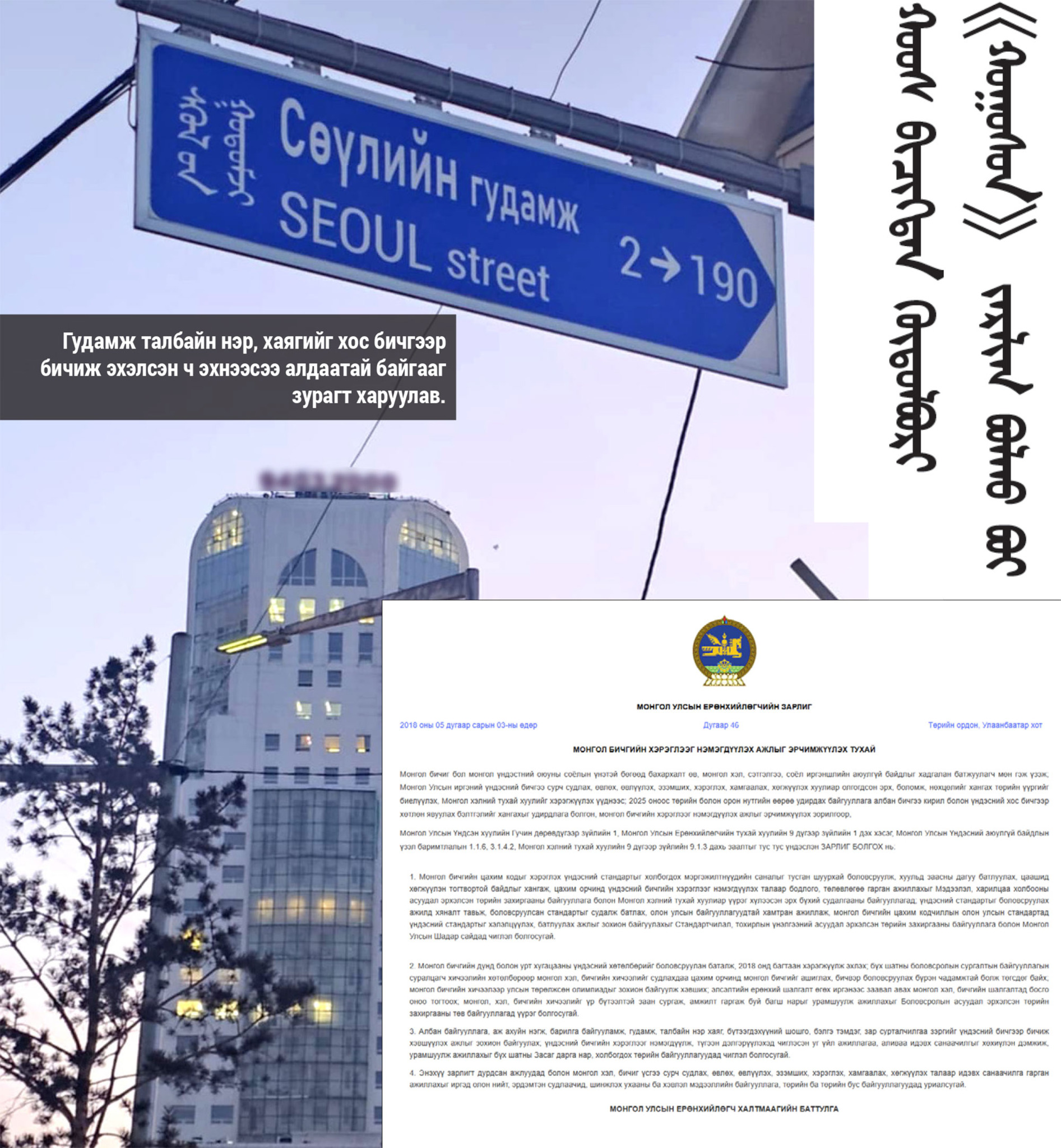 Мөн 2018 оны тавдугаар сарын 3-нд “Монгол бичгийн хэрэглээг нэмэгдүүлэх ажлыг эрчимжүүлэх тухай” Ерөнхийлөгчий зарлиг гарч байсан. Үнэхээр бид албан хэргээ кирилл болон үндэсний хос бичгээр хөтлөхөд бэлэн үү. Хос бичигтэн хөтөлбөр “хоосон” зарлиг болох вий.