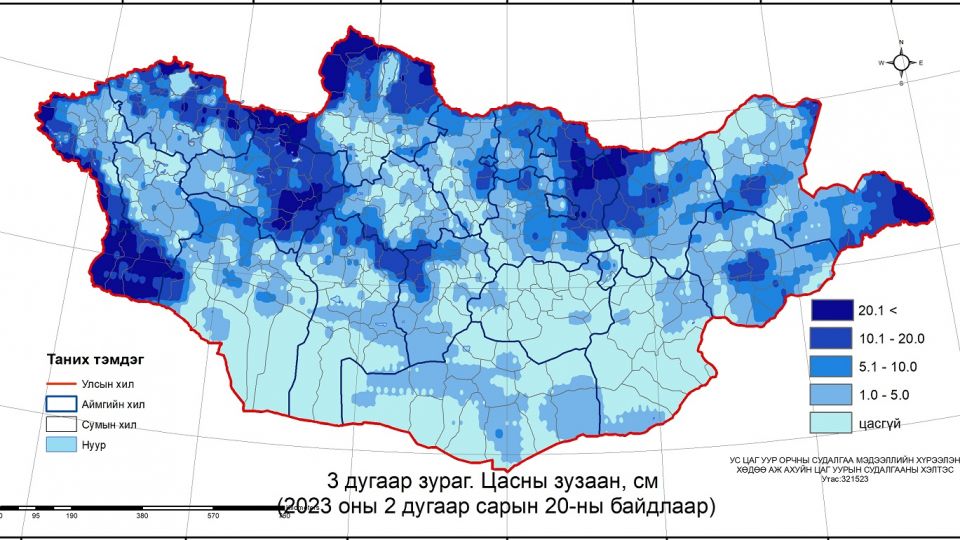 Харин Орхон, Дархан-Уулын нийт, Завхан, Хөвсгөл, Сэлэнгэ, Төв, Хэнтий, Сүхбаатар, Дорнодын зарим, Увс, Говь-Алтай, Архангай, Баянхонгор, Булганы ганц нэг сумдын нутгаар 6-10 см, бусад нутагт 1-5 см, гуу жалга, хунгарласан газартаа 15-30 см зузаан цастай байна.