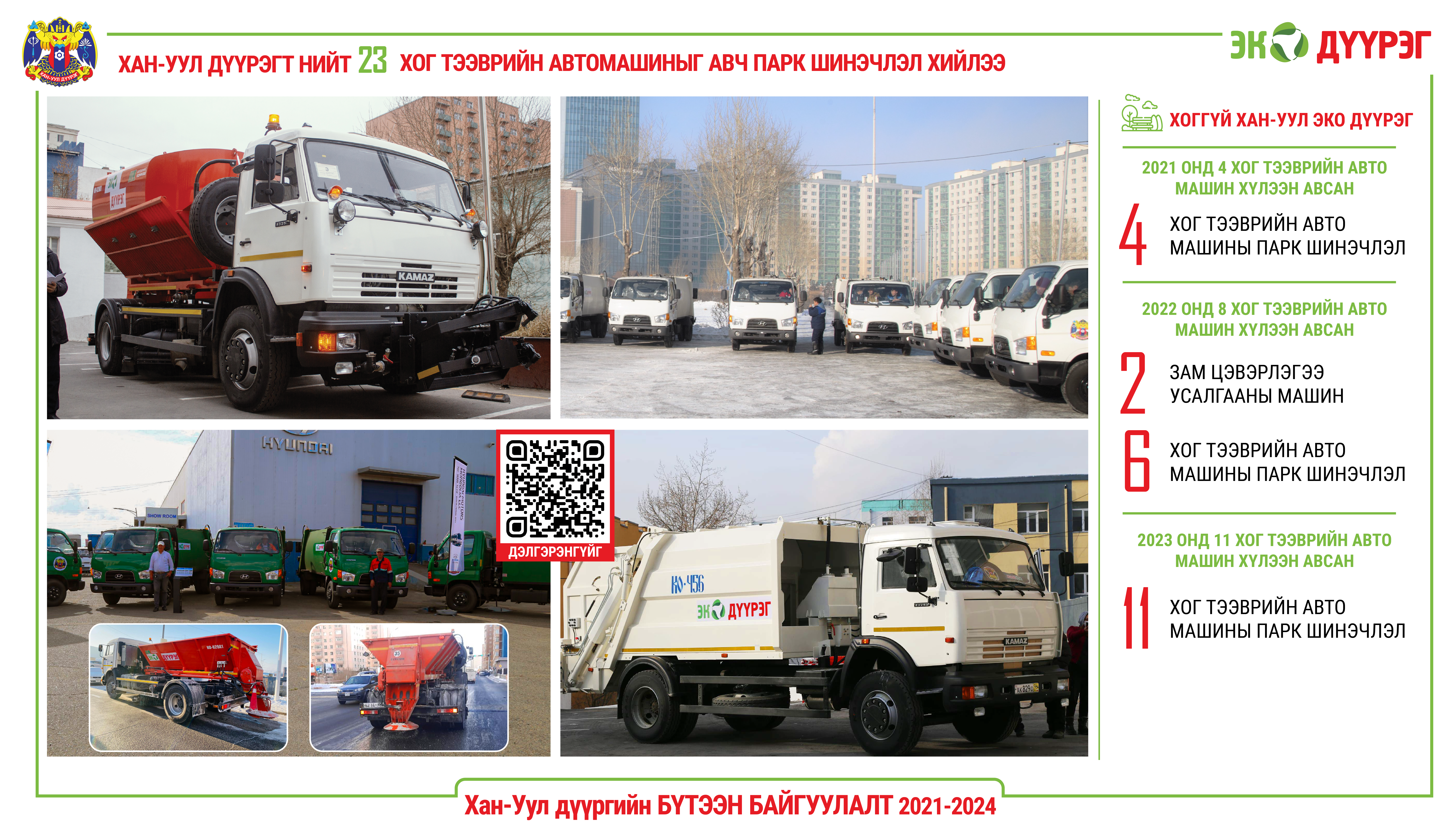 Хан-Уул дүүргийн Засаг даргын 2021-2024 онд хэрэгжих “Эко-Эрүүл дүүрэг” хөтөлбөрийн хүрээнд дүүргийн хөрөнгө оруулалтаар нийт 23 ширхэг хог тээврийн автомашинг хүлээлгэн өгч ПАРК шинэчлэлийг хийж, эко орчинг бүрдүүлэхэд ОНЦГОЙ анхааран ажиллаж буй.